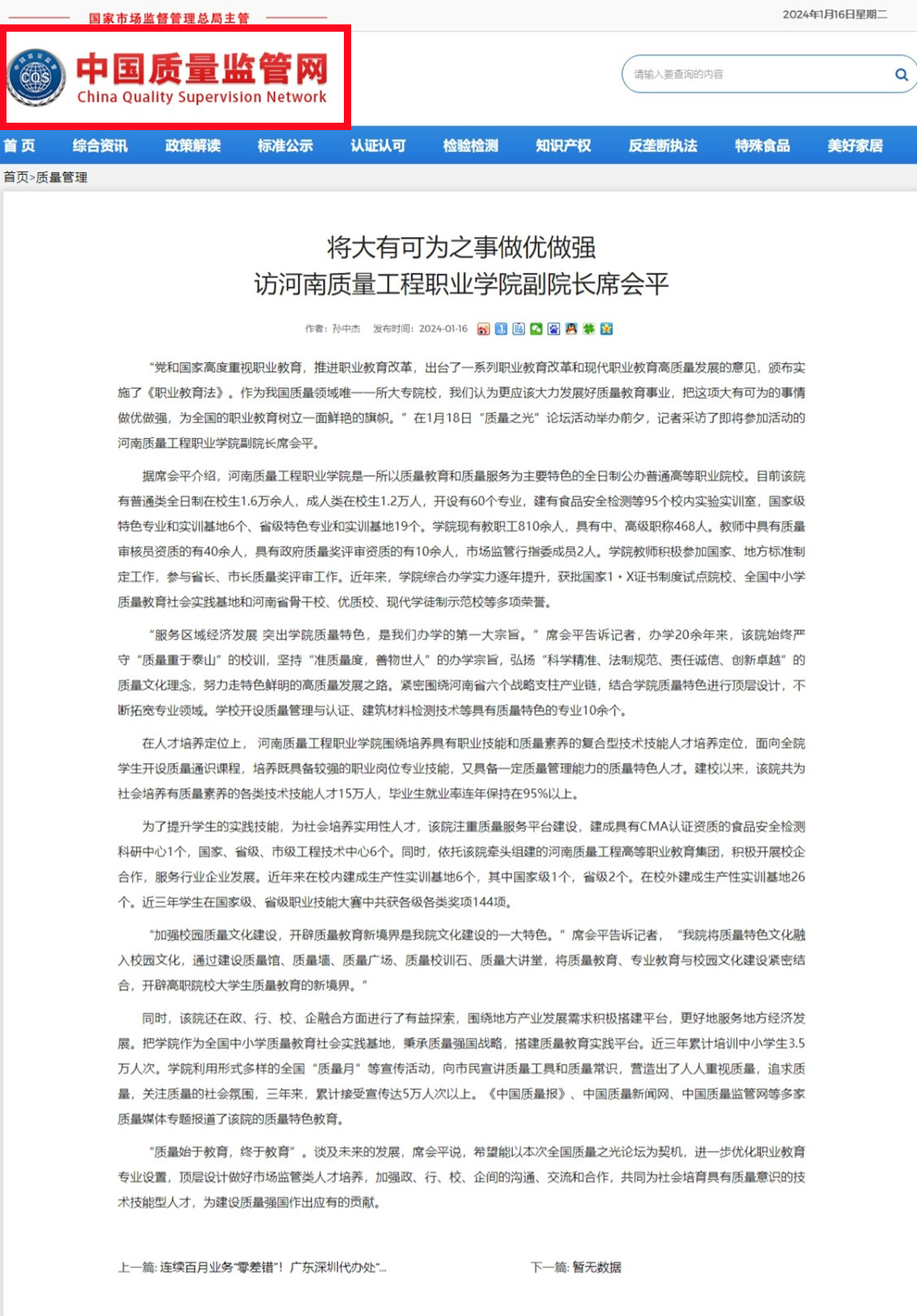 媒体之声 | 中国质量监管网、中国质量新闻网、河南质量网等:将大有可为之事做优做强--访老金沙9170登录副院长席会平