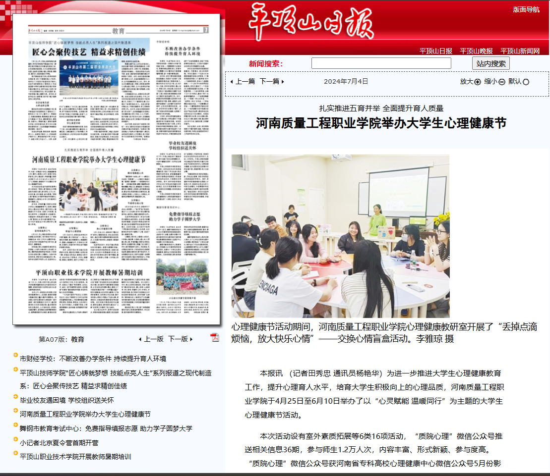 7月4号,《平顶山日报》对我院举办大学生心理健康节进行详细报道。