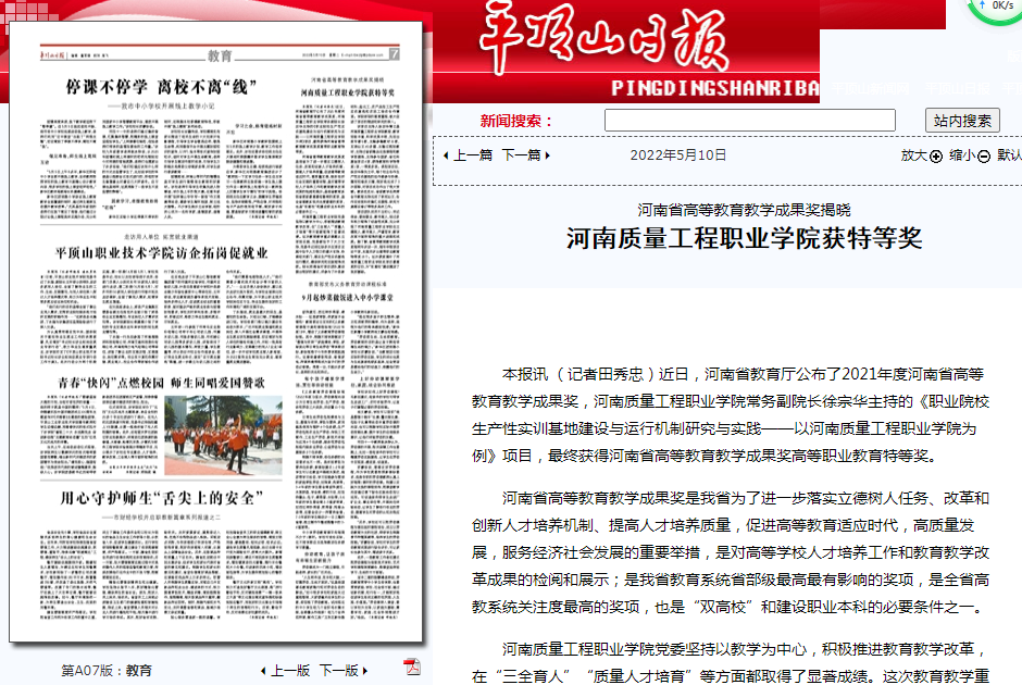 近日,《平顶山日报》、河南高校资讯网等诸多媒体,对我院荣获河南省高等教育教学成果奖特等奖情况进行了专题报道。