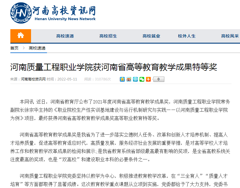 河南省高等教育教学成果奖是我省为了进一步落实立德树人任务、改革和创新人才培养机制、提高人才培养质量,促进高等教育适应时代,高质量发展,服务经济社会发展的重要举措,是对高等学校人才培养工作和教育教学改革成果的检阅和展示;是我省教育系统省部级最高最有影响的奖项,是全省高教系统关注度最高的奖项,也是“双高校”和建设职业本科的必要条件之一。