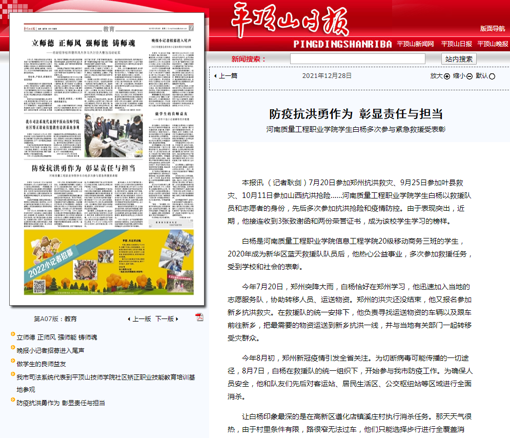 白杨是老金沙9170登录信息工程学院20级移动商务三班的学生,2020年成为新华区蓝天救援队队员后,他热心公益事业,多次参加救援任务,受到学校和社会的表彰。