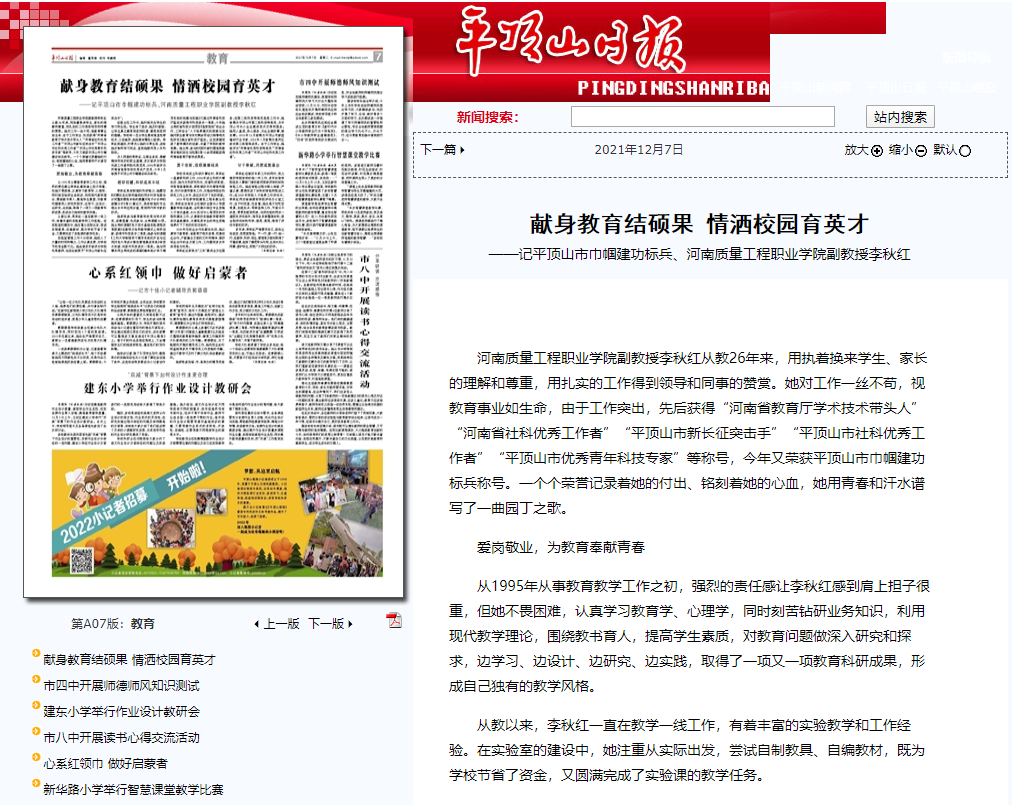 为人师表的李秋红,以敬业务实、奉献精神和良好的职业道德,多次被评为学院先进工作者和院优秀党员,2006年被评为河南省高等学校优秀共产党员,今年3月被授予平顶山市巾帼建功标兵称号。