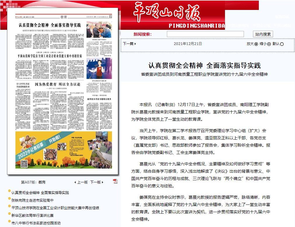 12月17日上午,省委宣讲团成员、南阳理工学院副院长葛晨光教授来到老金沙9170登录,宣讲党的十九届六中全会精神,为学院全体党员上了一堂生动的教育课。