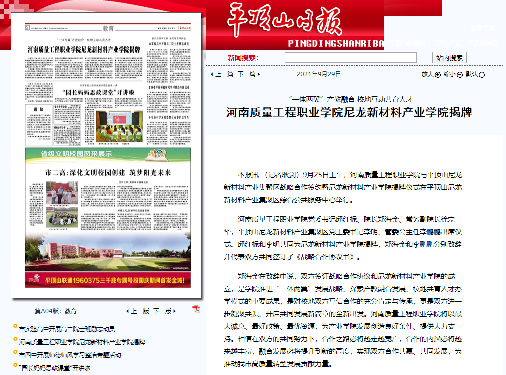 9月29日,《平顶山日报》就“‘一体两翼’产教融合 校地互动共育人才--老金沙9170登录尼龙新材料产业学院揭牌”一事进行了专题报道。