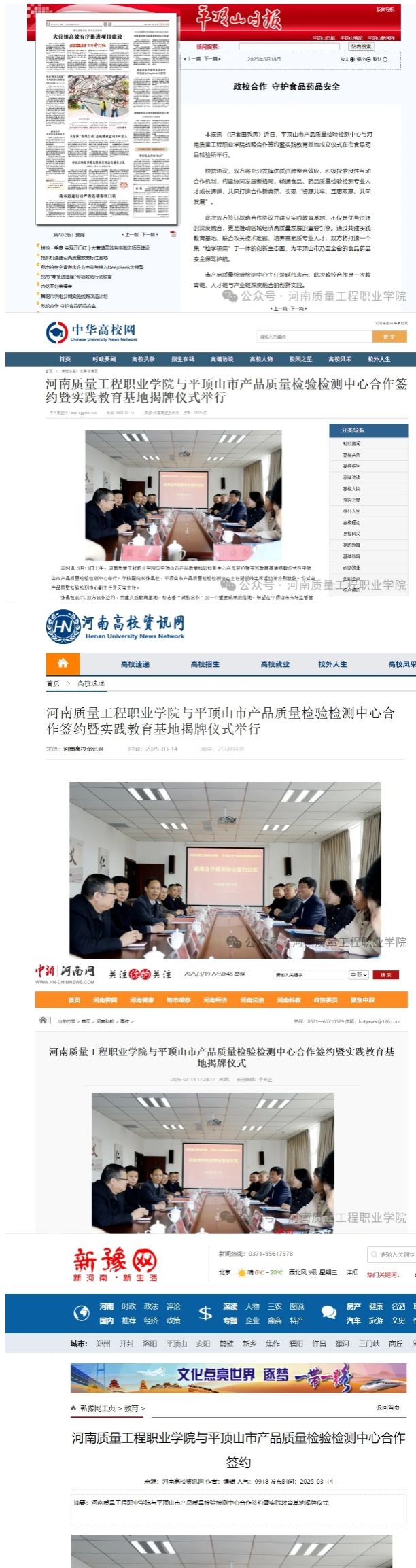 近日,《平顶山日报》、中华网、中华高校网、河南高校资讯网、河南高校行等媒体平台对我院与平顶山市产品质量检验检测中心战略合作签约情况进行了报道。