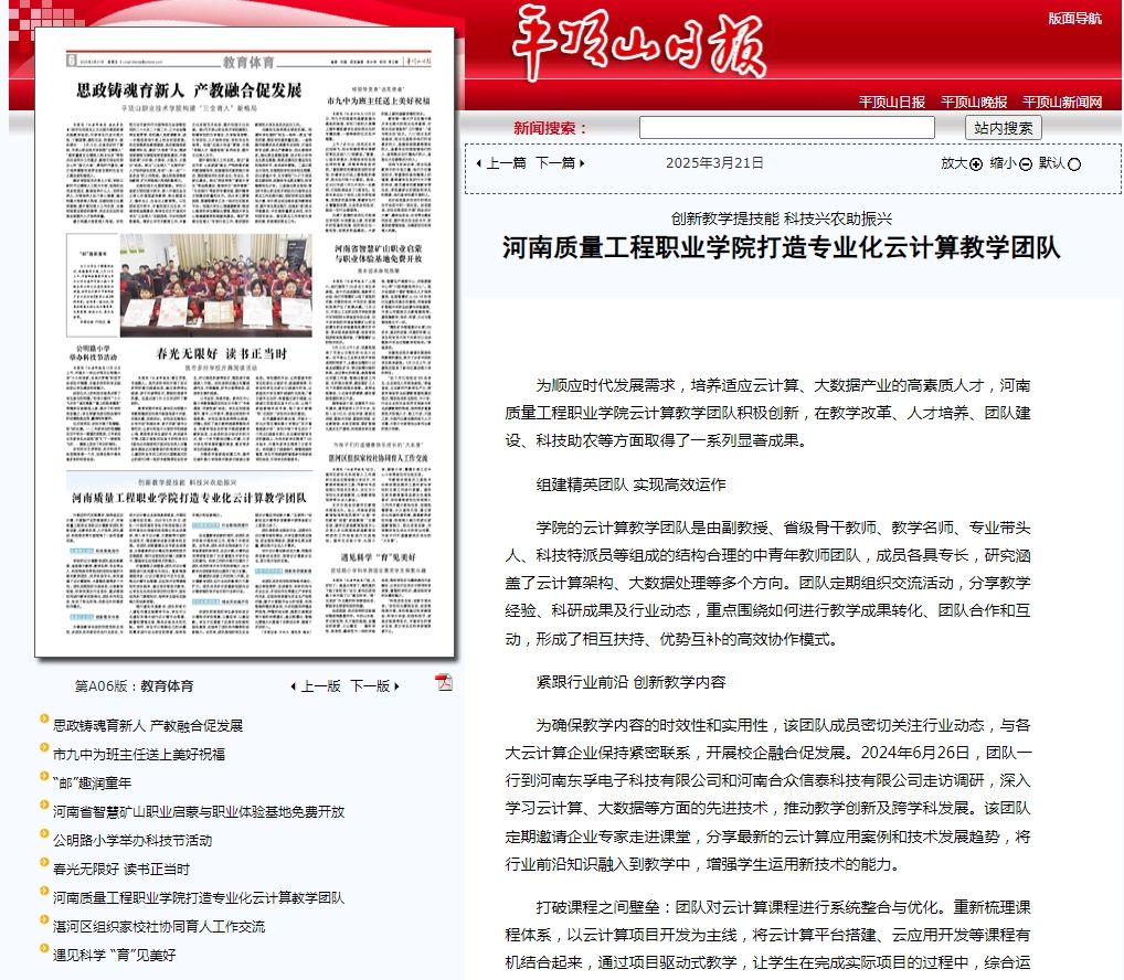 学院的云计算教学团队是由副教授、省级骨干教师、教学名师、专业带头人、科技特派员等组成的结构合理的中青年教师团队,成员各具专长,研究涵盖了云计算架构、大数据处理等多个方向。团队定期组织交流活动,分享教学经验、科研成果及行业动态,重点围绕如何进行教学成果转化、团队合作和互动,形成了相互扶持、优势互补的高效协作模式。
