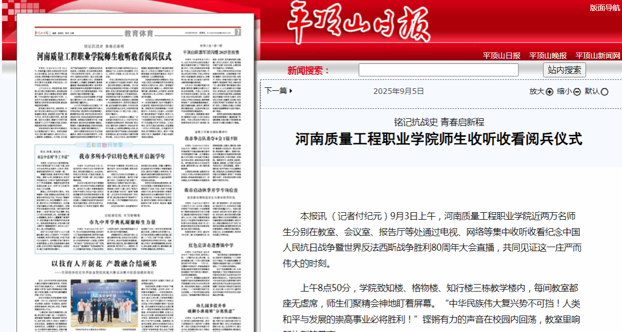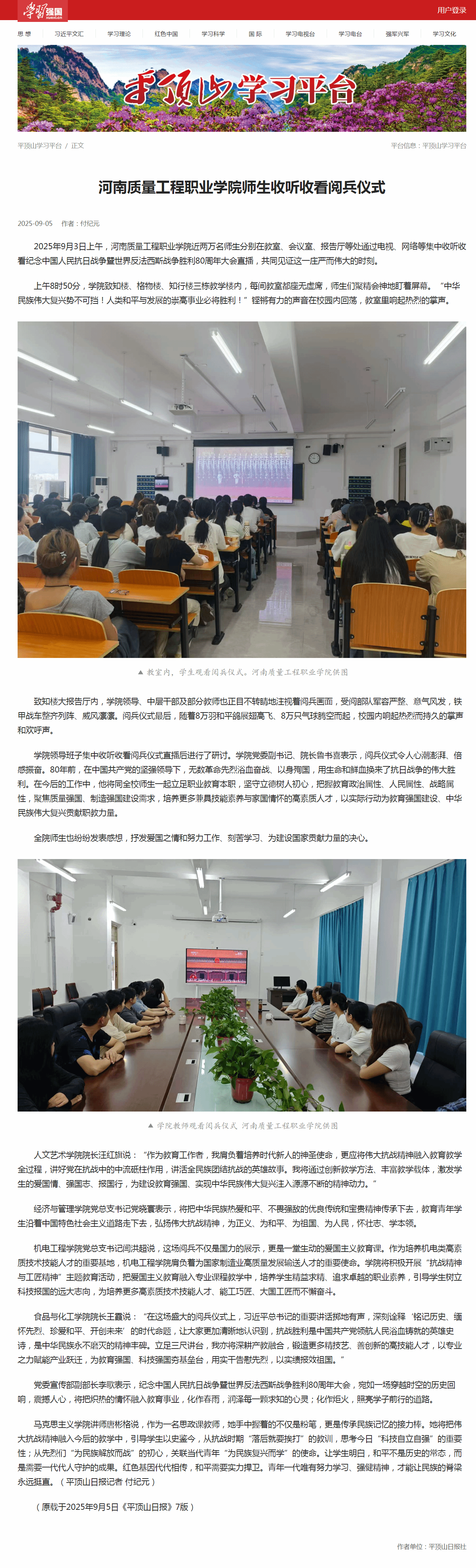 学习强国、平顶山日报:老金沙9170登录师生收听收看阅兵仪式