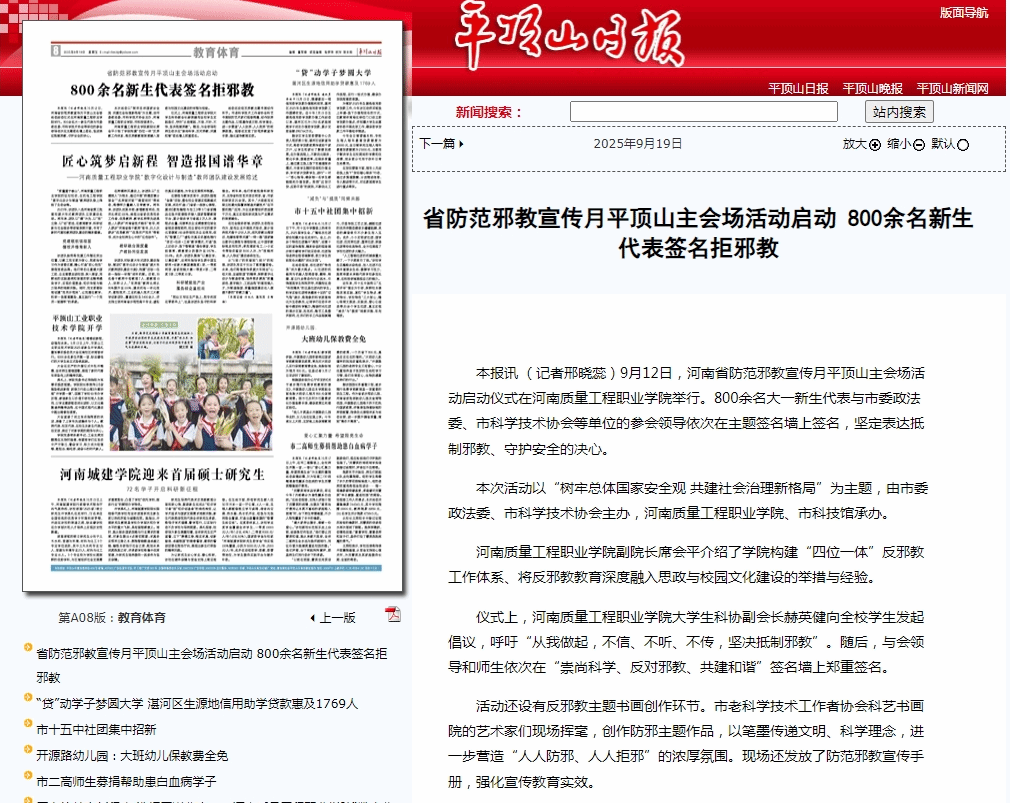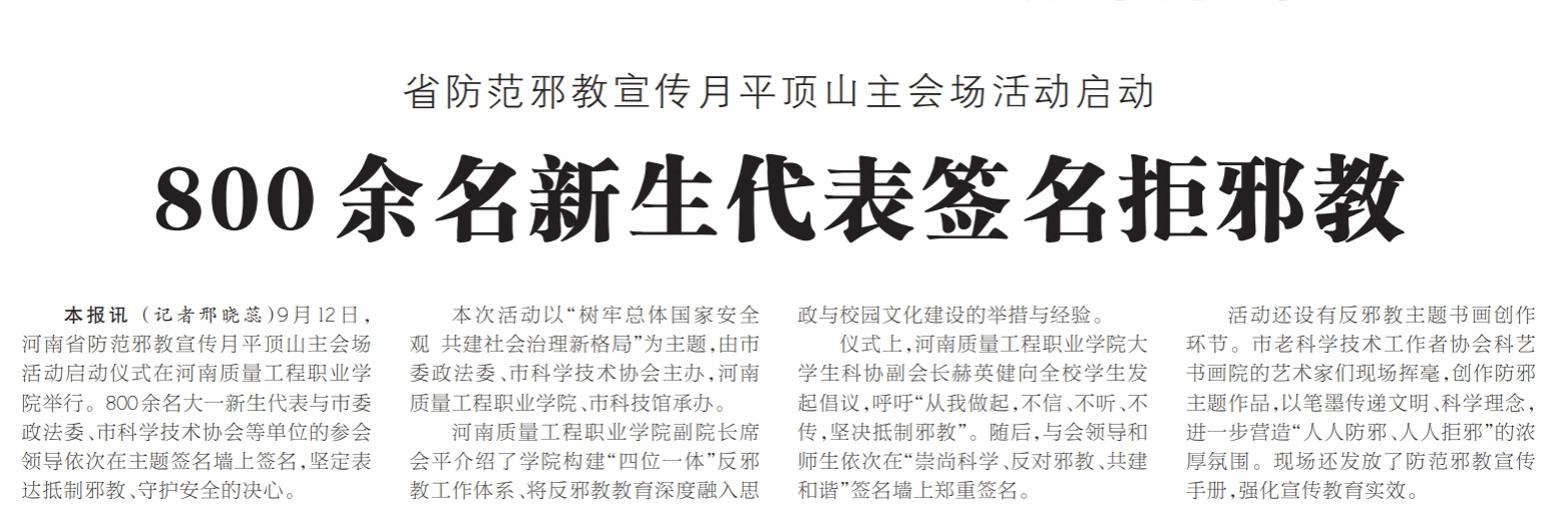 平顶山日报:省防范邪教宣传月平顶山主会场活动启动 800余名新生代表签名拒邪教
