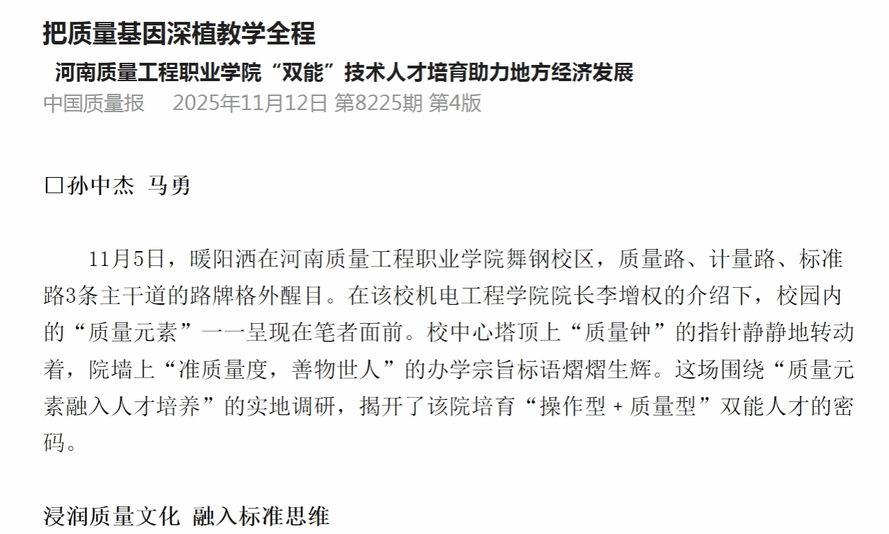 11月12日,《中国质量报》对我校机电工程学院“双能”技术人才培育助力地方经济发展的情况进行了报道。全文如下: