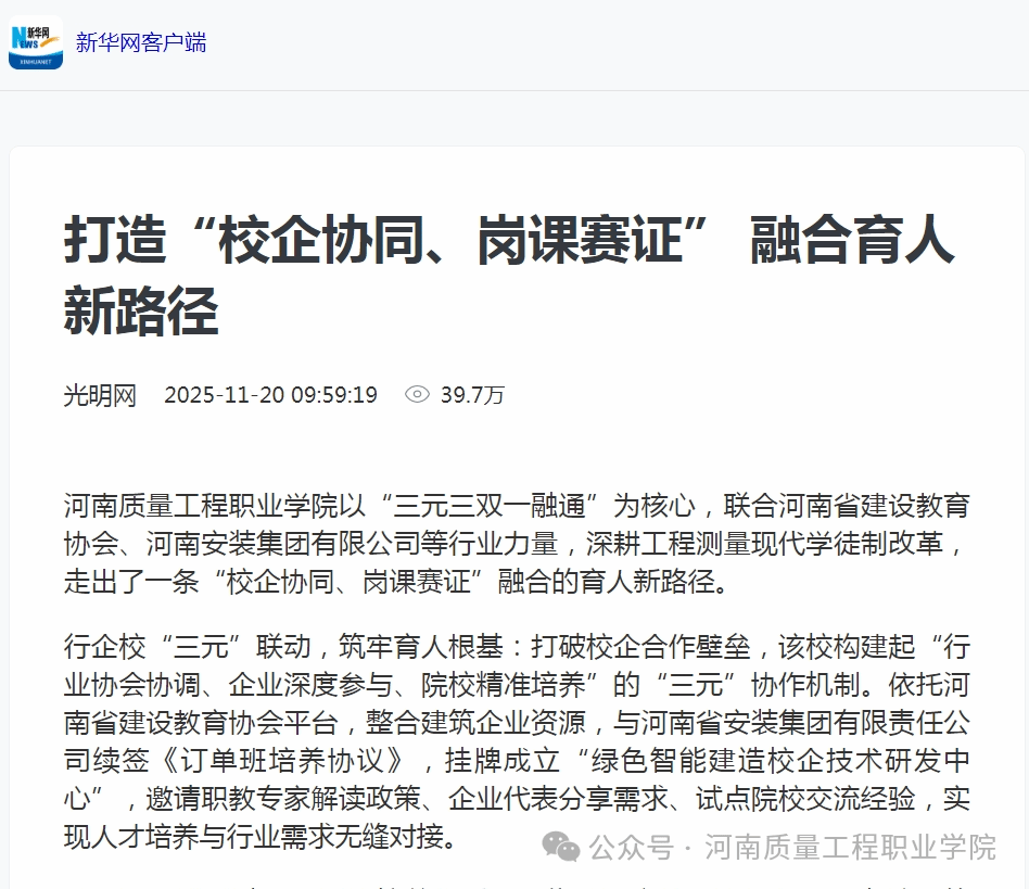 新华网客户端:打造“校企协同、岗课赛证” 融合育人新路径