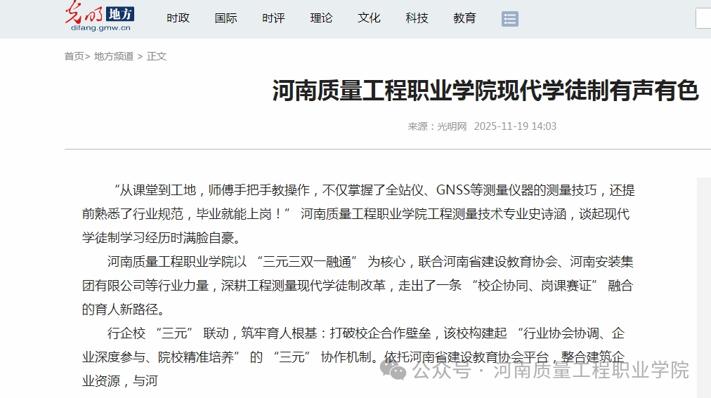 老金沙9170登录以“三元三双一融通”为核心,联合河南省建设教育协会、河南安装集团有限公司等行业力量,深耕工程测量现代学徒制改革,走出了一条“校企协同、岗课赛证”融合的育人新路径。